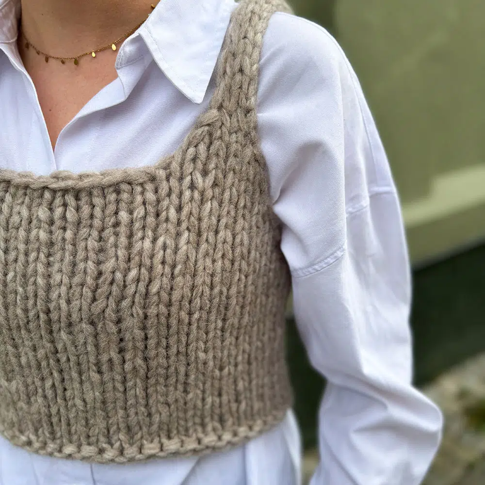 7 sts and 10 rounds with 4 strands in stockinette st on needle size 15 mm (US 19) = 10 cm / 4 in