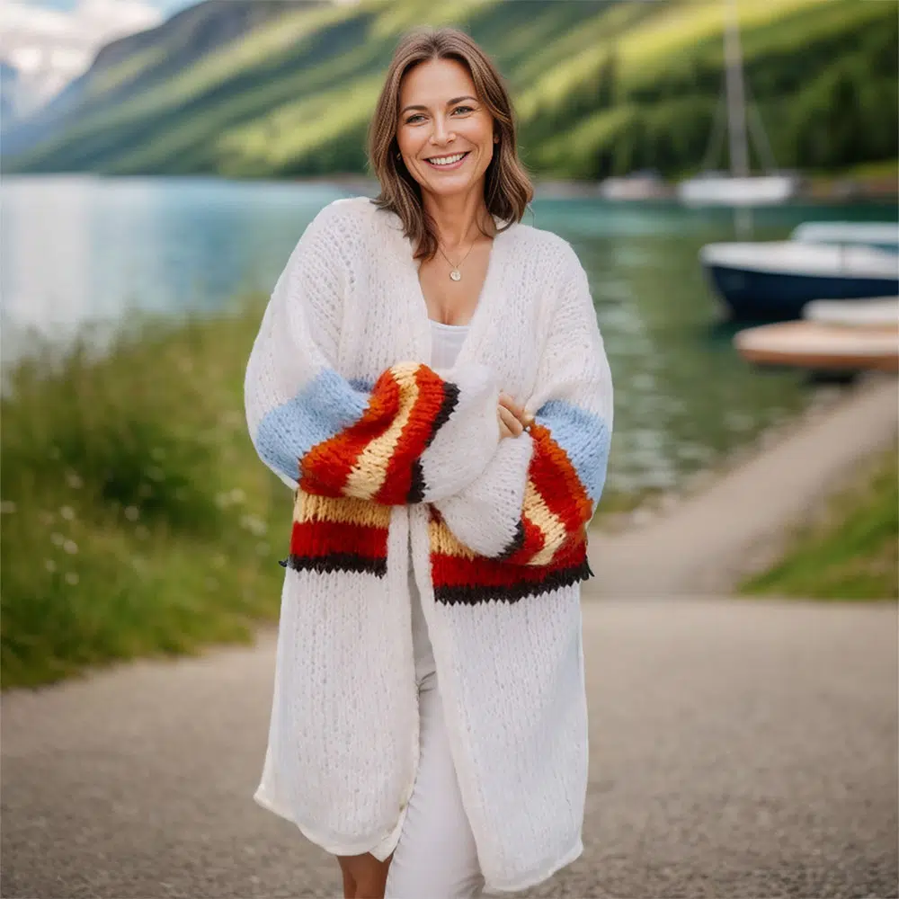 8 sts in stockinette stitch with double yarn on 12 mm (US 17) needles = 10 cm / 4 in