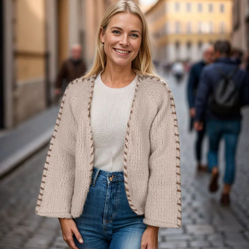 10 sts of stockinette st with double strand on needle 9 mm (US 13) = 10 cm