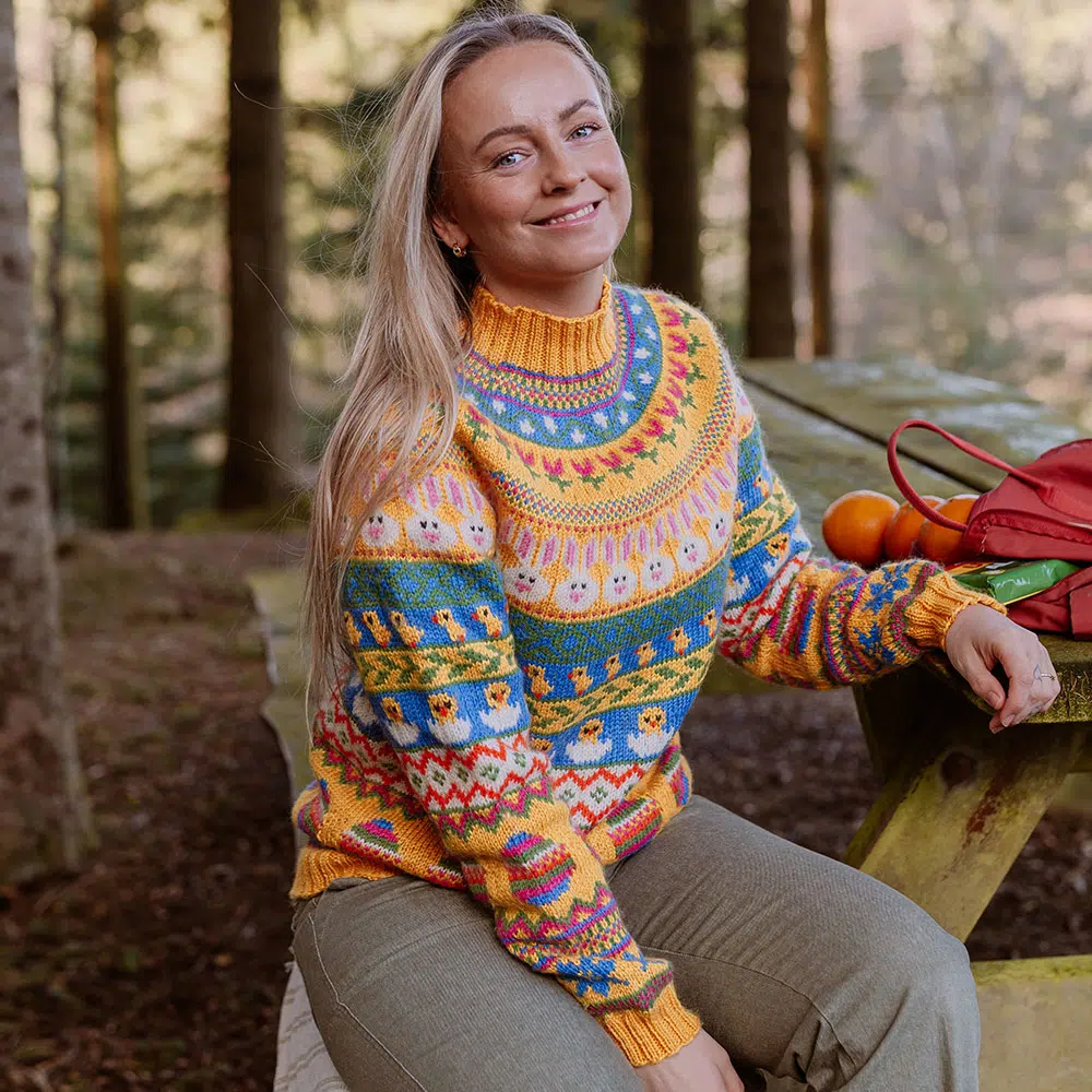 This delightfully ugly Easter sweater is knitted from the bottom up with a round yoke.