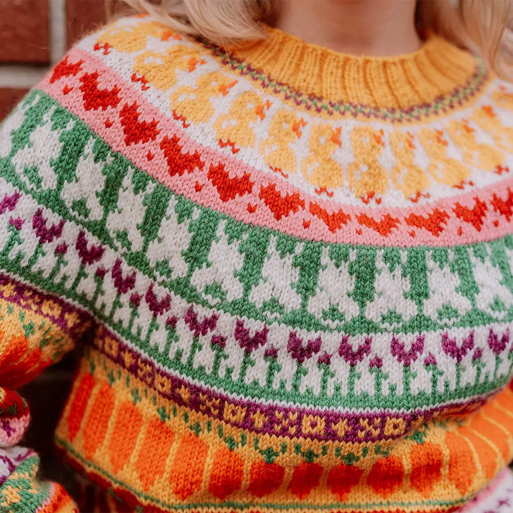 The sweater is knitted bottom up with a round yoke.